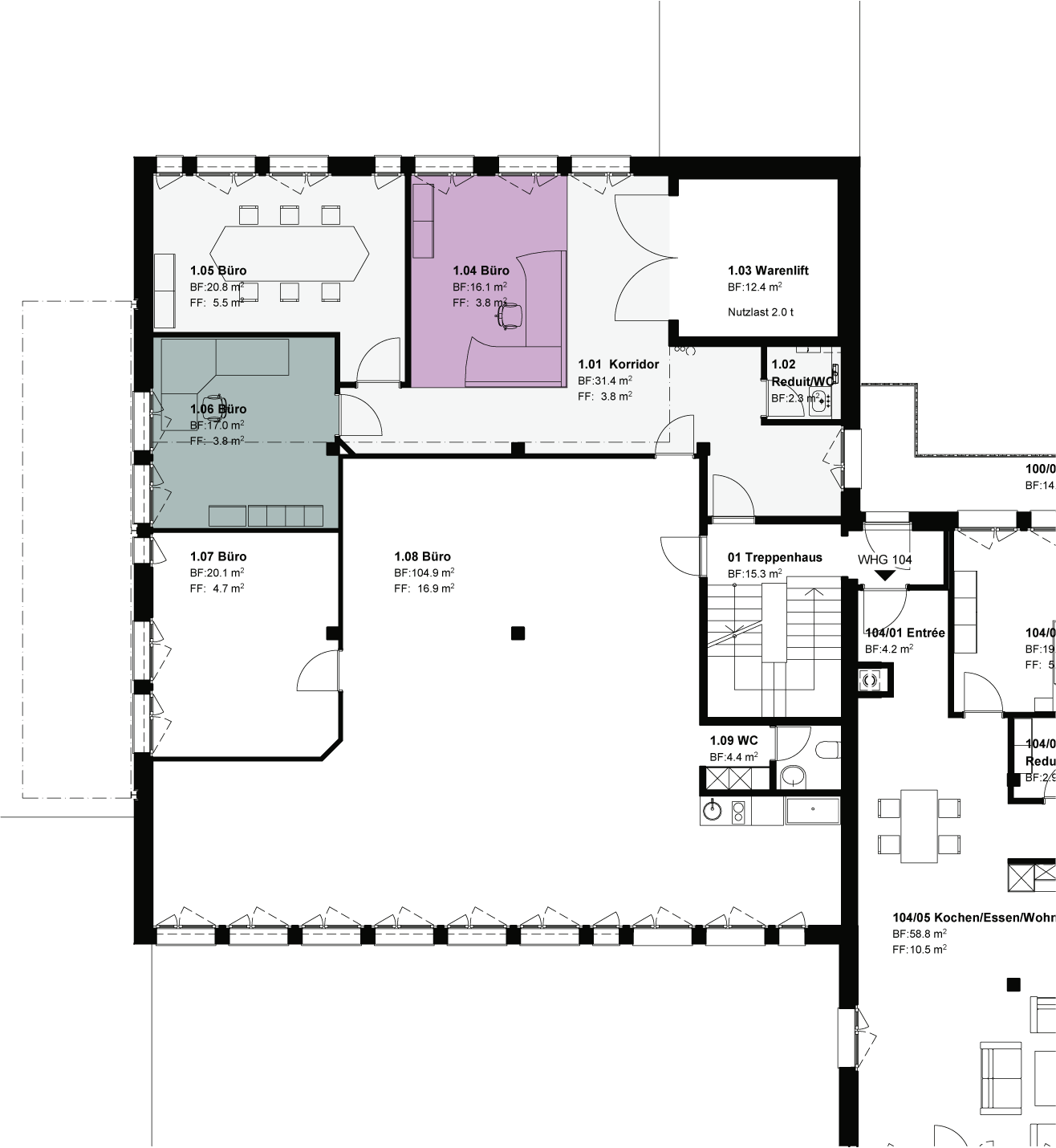 | 1.04 | Cowork-Büro, 1. OG geteilte Nutzung inbegriffen |