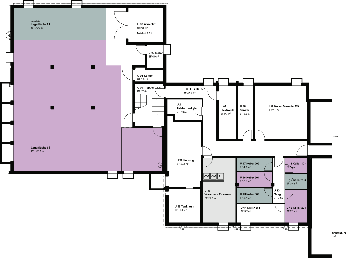 | 05 | Lager mit Überhöhe (~3,5 m) und Warenliftzugang |